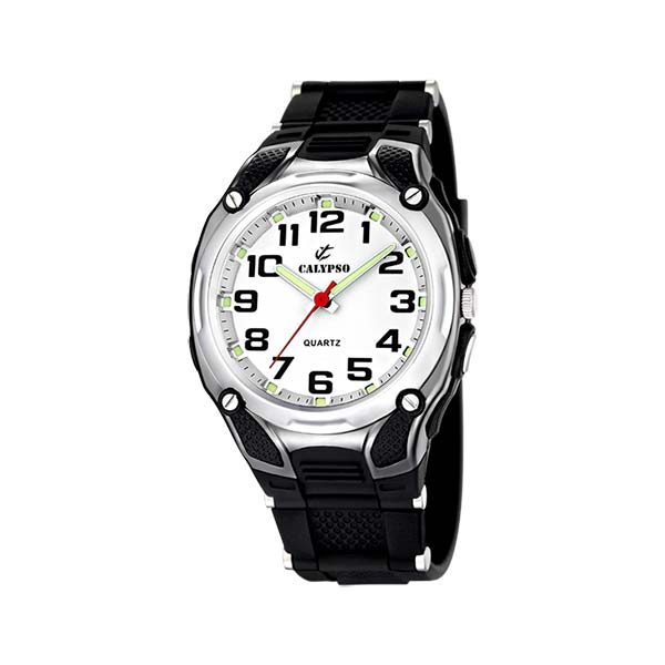 Ročna ura Calypso . Ohišje in pas ročne ure Calypso je iz  plastike in zatesnjeno do 10 ATM. Številčnico pokriva pleksi steklo. Primerna za vsako dnevno uporabo tudi v vodi.