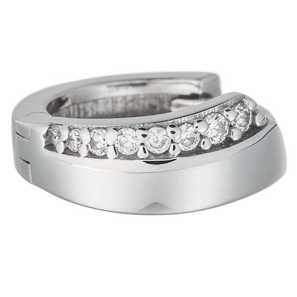 Material: 925/- srebro Barva: srebrna Zaponka: zaskočna zaponka Vrsta kamna: cirkonij Prodajna enota: 1 par Teža: 3,24 g Klasične in brezčasni uhani z zaskočno zaponko so bile izdelane v visoki draguljarski kakovosti. Obročasti uhani iz srebra 925/- so okrašeni z 8 čudovito lesketajočimi se cirkonijevimi kamni. Plemeniti dodatek, ki izpopolni vsak vsakdanji videz. Praktična zapirala z loputo zagotavljajo varen oprijem in nudijo visoko stopnjo udobja. Premer: 10,0 mm Širina: 4,3 mm Debelina: 1,8 mm