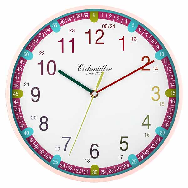 Poučna stenska ura za otroke v roza barvi s pomično sekundo.