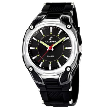 Ročna ura Calypso . Ohišje in pas ročne ure Calypso je iz  plastike in zatesnjeno do 10 ATM. Številčnico pokriva
