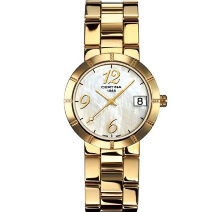 Modna ženska ura Certina. Jekleno ohije in pašček z pozlato. Steklo je safirno odporno na praske. Vodotesnost: 10ATM Premer: 31mm