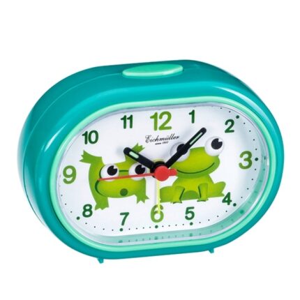 Otroška budilka Eichmuller z motivom Šifra: 9855-3 Motiv: Žabice Barva ure: Zelena temnejša Material: Plastika Velikost: 65x90mm Baterije priložene: NE
