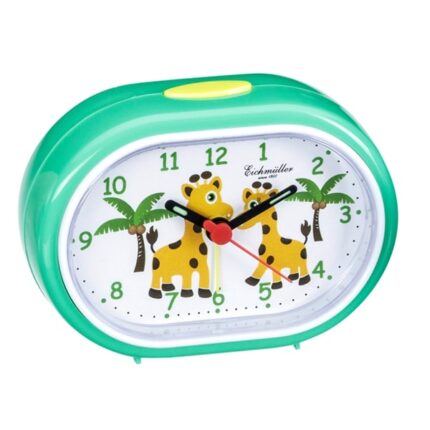 Otroška budilka Eichmuller z motivom Šifra: 9855-5 Motiv: Žirafi Barva ure: Zelena Material: Plastika Velikost: 65x90mm Baterije priložene: NE Garancija: