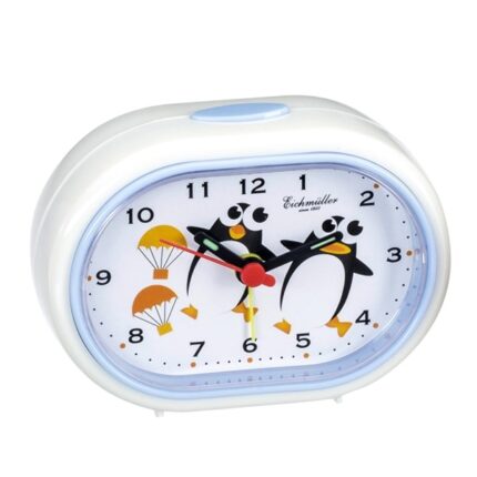 Otroška budilka Eichmuller z motivom Šifra: 9855-8 Motiv: Pingvin Barva ure: Bela, svetlo modra Material: Plastika Velikost: 65x90mm Baterije priložene: